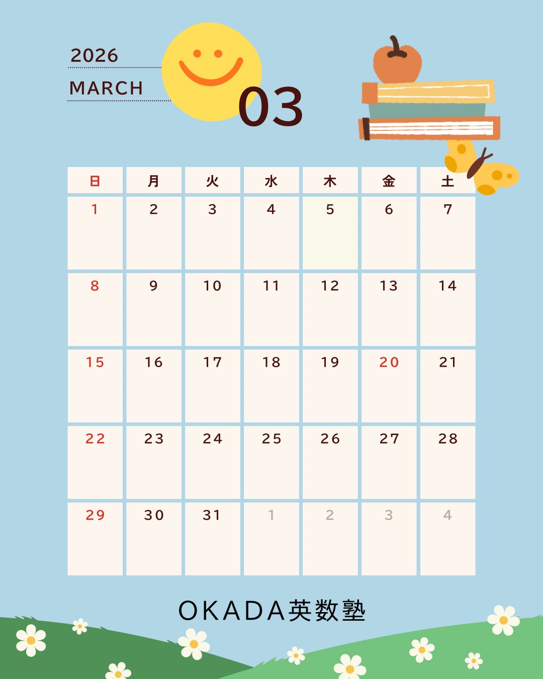 2026年3月カレンダー 2026 3/01 お知らせ 2026-03-01 少しずつ暖かくなってきましたね♪♪3月は休みなく授業をさせていただきます(講師の都合で4月は1日〜6日がお休みになる為)。新しい学年が始まる前に、解らないところをクリアにできると4月からの学校の授業がスムーズに頭に入るのでオススメです☆彡英検対策もしていますので、ご興味のあるかたはお問い合わせ下さい♪ お知らせ