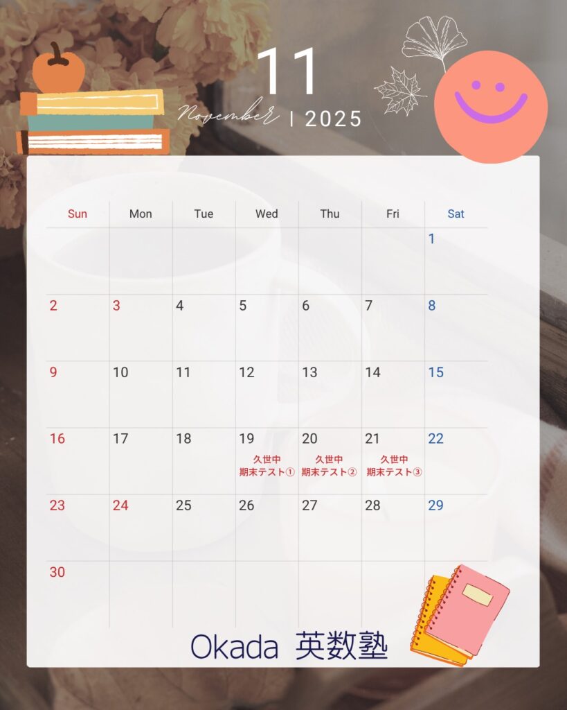 最近、一気に涼しくなりましたね!11月は文化祭等の行事に加えて、期末テストのある学校が多いです(久世中は19日(水)〜21日(金))。インフルエンザやコロナが流行り出したようなので、皆さん気をつけましょうね(^-^) その他